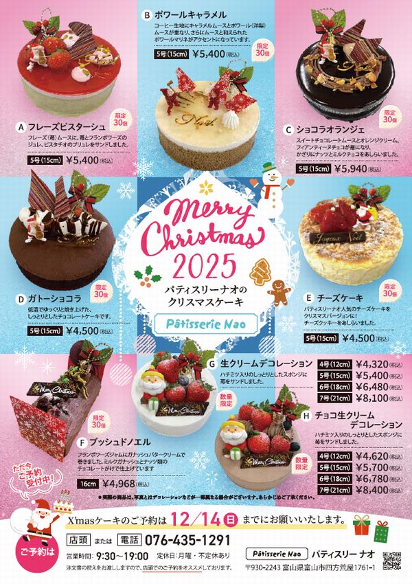 クリスマスケーキのご準備もお早めに。現在、予約受付中です。